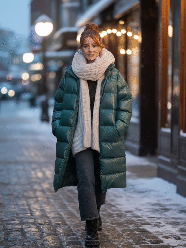 A long padded puffer coat layered with a thick scarf and denim keeps the cold out during icy mornings. This winter outfit focuses on warmth while still looking clean and casual.