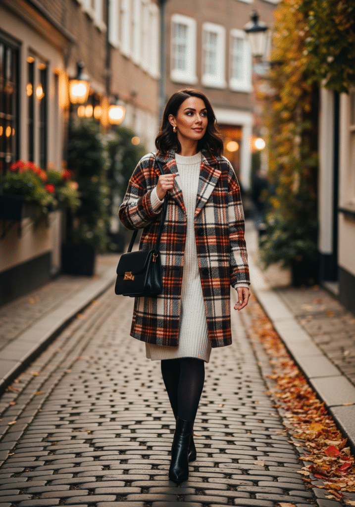A plaid oversized coat styled over a knit dress offers a balanced mix of structure and comfort. Paired with tights and boots, this winter outfit feels polished and cozy at the same time.