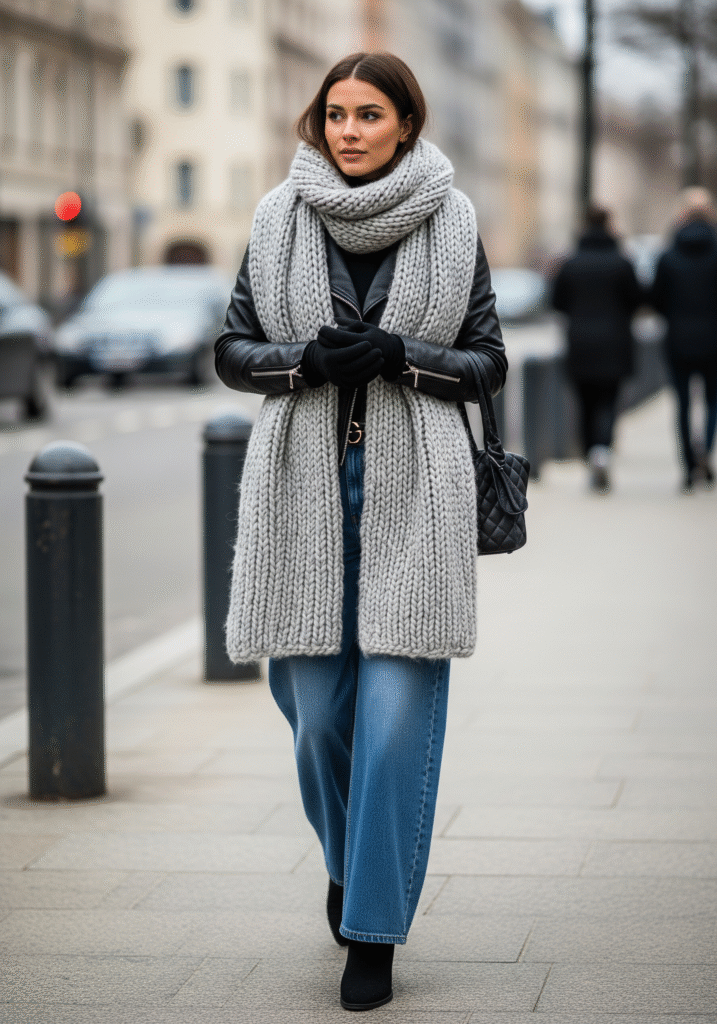A black leather jacket combined with a large scarf and wide-leg jeans brings edge and warmth together. This winter outfit blends bold style with practical layering.