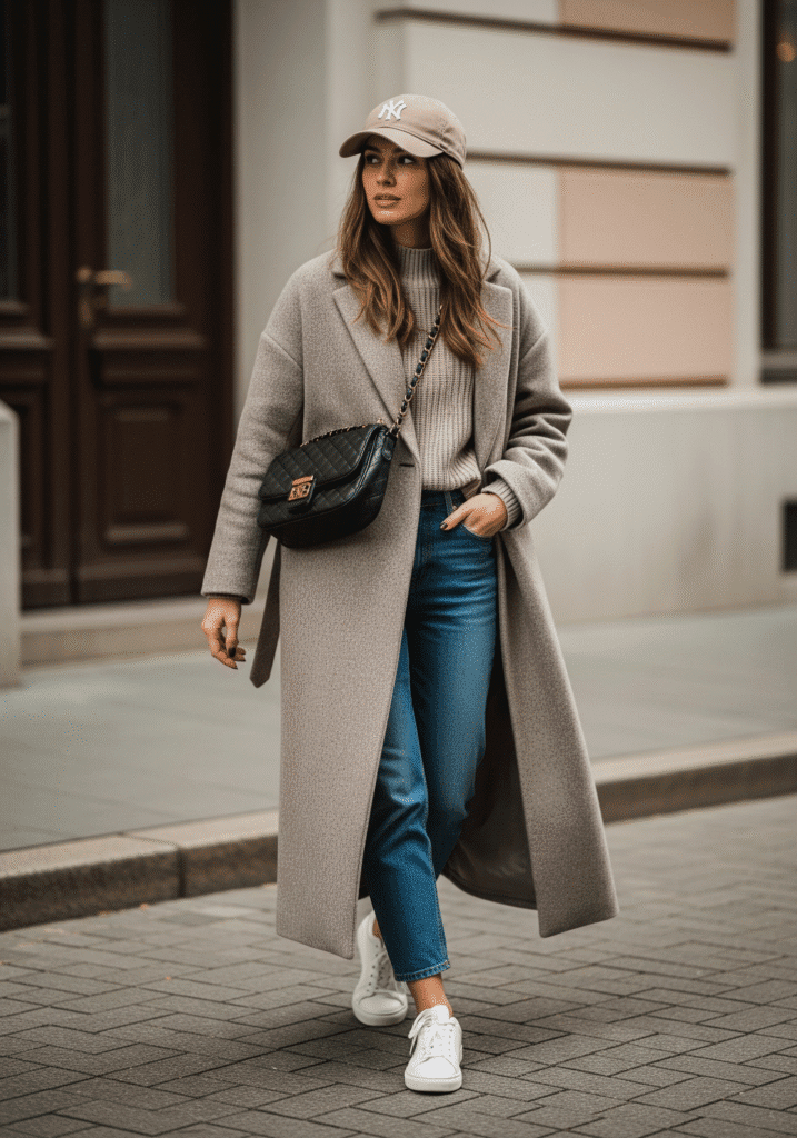 A neutral coat styled with denim, sneakers, and a baseball cap creates an easygoing winter outfit. This look feels casual but still looks put together and modern.