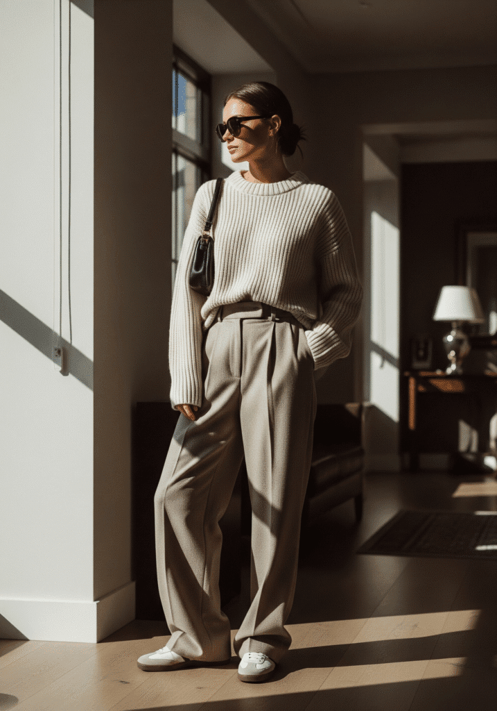 An oversized sweater tucked into wide-leg trousers finishes the winter season with comfort and style. Paired with sneakers or loafers, this winter outfit feels relaxed and balanced.