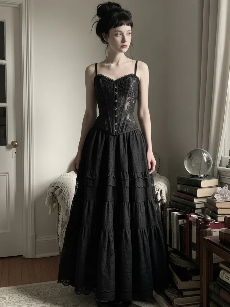 Long Black Skirt with Layered Lace and Fitted Corset Top