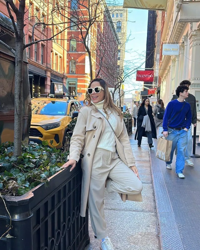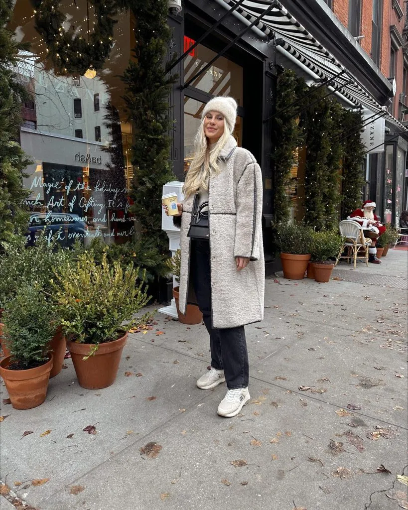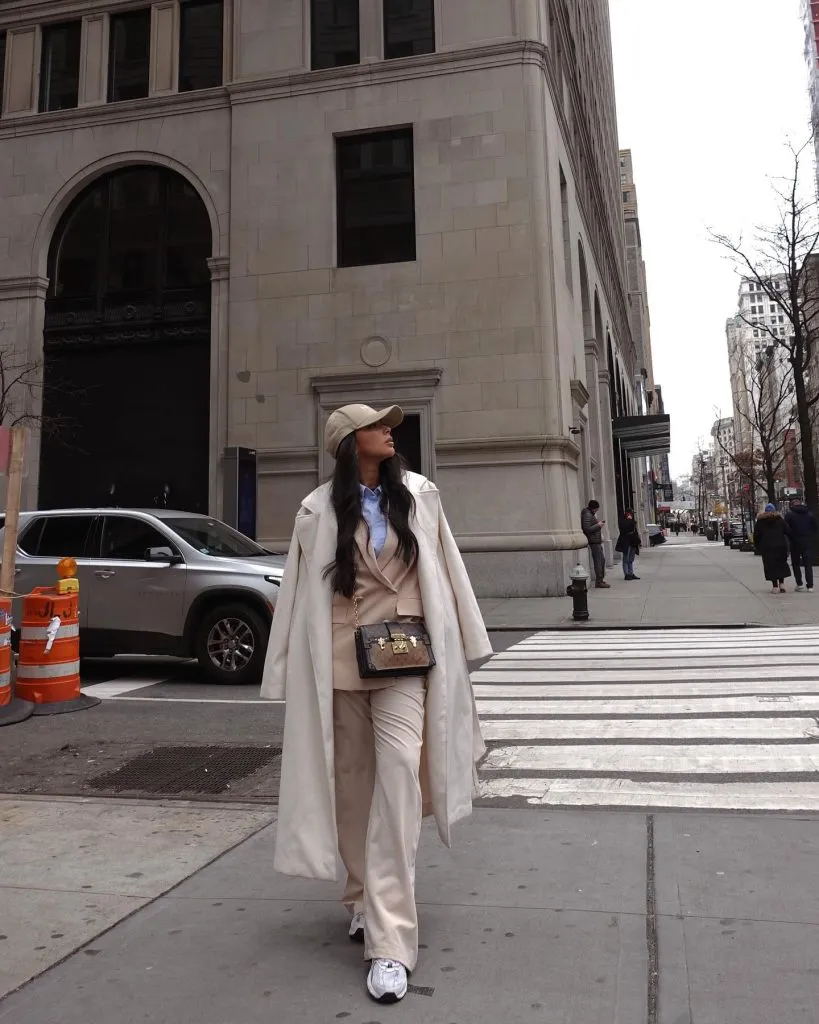 Wearing an oversized white coat in NYC makes you look elegant and confident. Adding a statement hat lifts the whole outfit, giving it a soft but sophisticated feel. This all-white look grabs attention without being too loud and lets your personality shine.