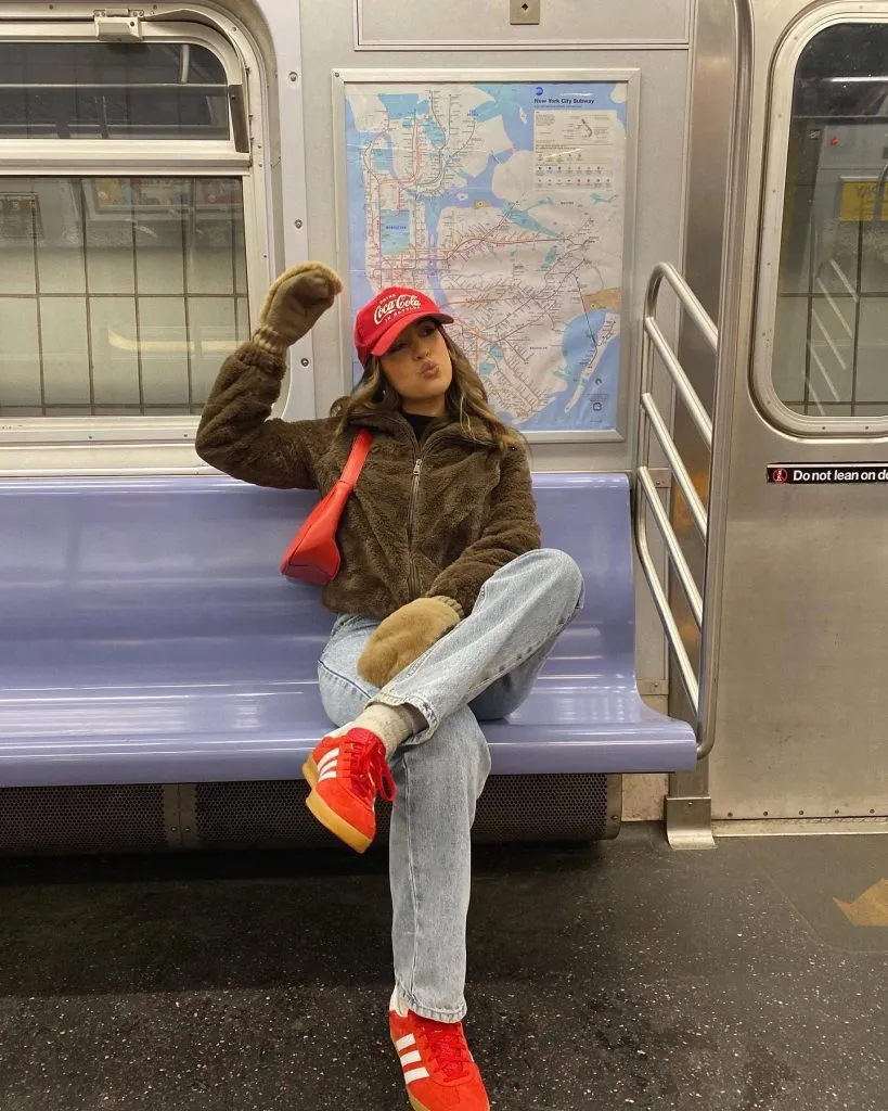 A faux fur jacket gives a cozy and luxurious feel. Adding a bright red cap makes the outfit lively and playful. Pairing these with denim balances the look, making it casual yet fashionable.