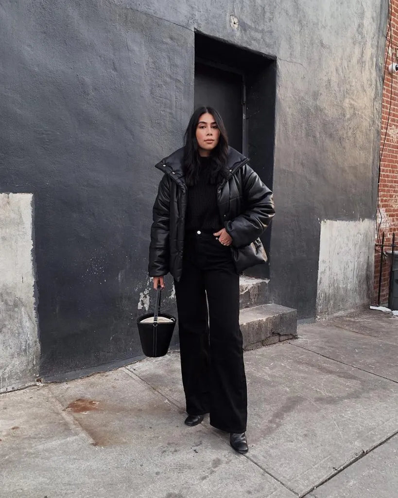 A black puffer jacket paired with wide-leg pants creates a modern, bold look that keeps you warm without adding bulk. The loose pants add movement, making the outfit feel light and stylish. This outfit is great for those who want a bit of edge while staying practical.