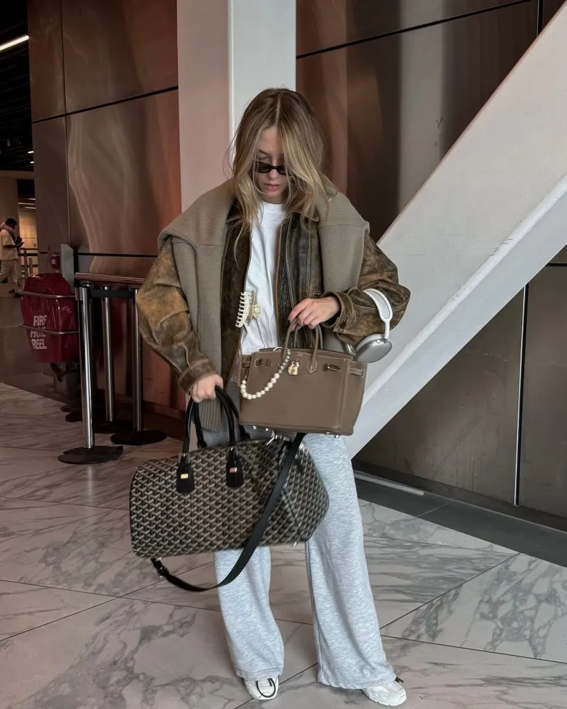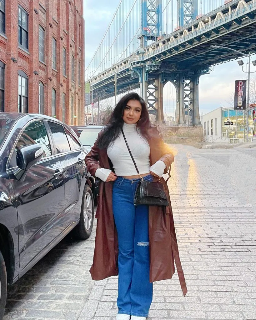 A brown leather coat has a vintage, classic feel. When worn with denim, it creates a casual but stylish look that’s perfect for walking around the city. This outfit tells a story of effortless cool and timeless fashion.