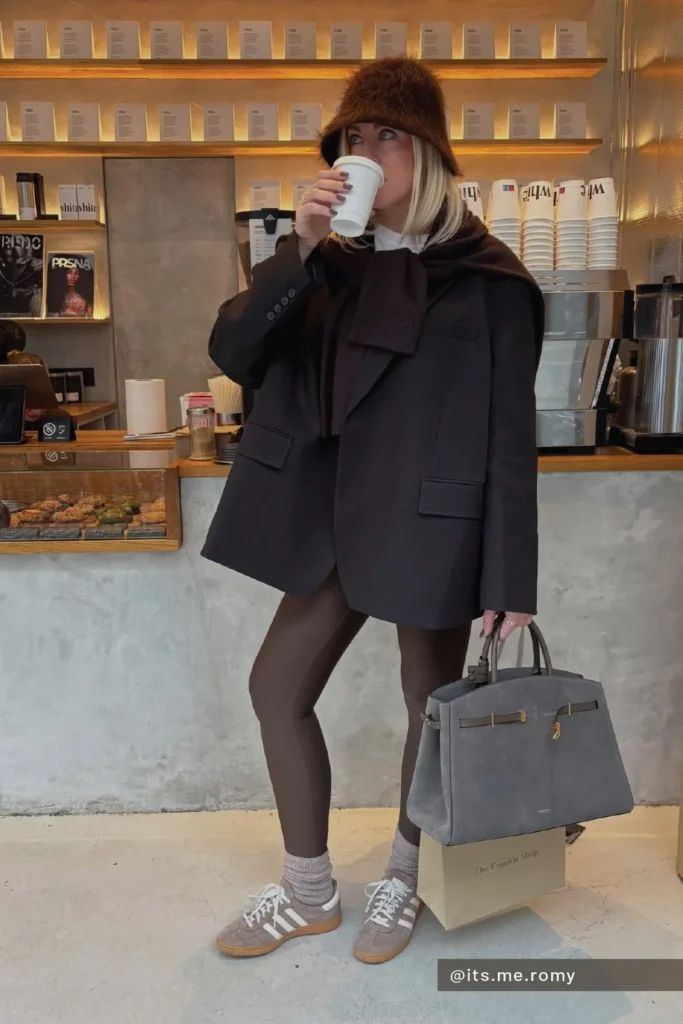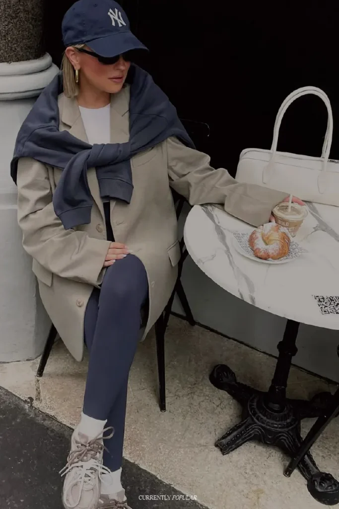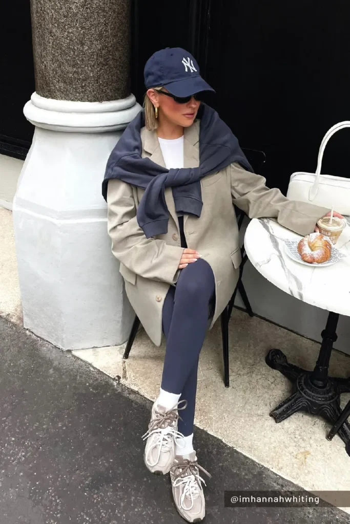This athleisure outfit blends structure with comfort by layering an oversized blazer over a fitted legging set. The tailored jacket instantly sharpens the relaxed base, while sneakers and slouchy socks keep the look grounded in casual wear. The mix of polished and sporty pieces makes this outfit easy to wear beyond workouts. It is a simple way to make athleisure outfits women rely on feel more intentional for everyday activities.