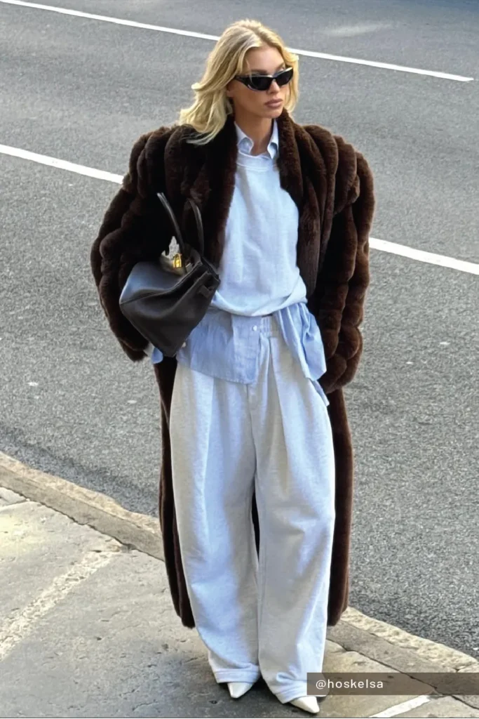 This look is built on contrast, pairing casual sweatpants with a classic button-down shirt. A bold outer layer, like a faux fur coat, elevates the entire outfit without changing the base pieces. Keeping the color palette neutral allows the proportions to stand out naturally. This approach turns lounge staples into athleisure outfits women can wear confidently outside the house.