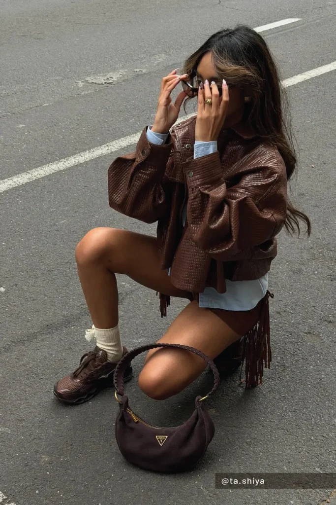 This look works well for transitional weather when heavier layers feel unnecessary. A leather jacket adds structure and style to casual shorts. Trainers and socks keep the outfit rooted in athleisure comfort. It is an easy option for casual days that still involve being active and out of the house.