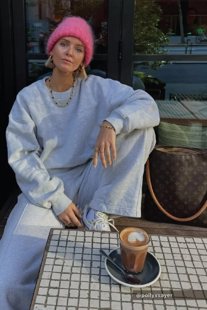 Matching sweat sets remain a cold-weather favorite because of their comfort and relaxed fit. Adding a bright beanie and statement jewelry creates contrast and keeps the outfit visually interesting. Sneakers make the look practical for daily wear. This combination shows why athleisure outfits women rely on stay popular through colder seasons.
