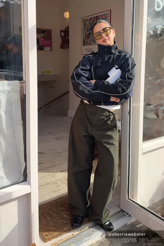 This outfit combines familiar athletic shapes with everyday basics. A cropped track jacket balances well with wide-leg pants, creating a relaxed yet styled silhouette. Loafers add a casual polish that suits long days out. It is a natural extension of athleisure outfits women wear that blend sport and daily dressing.