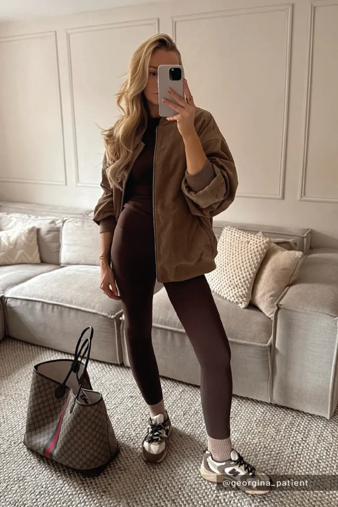 Matching sets offer simplicity, especially in rich neutral tones. A bomber jacket adds structure and makes the outfit wearable beyond lounging or exercising. This combination works well for casual outings, errands, or relaxed social plans. It highlights how athleisure outfits women gravitate toward often rely on coordinated pieces that feel effortless.
