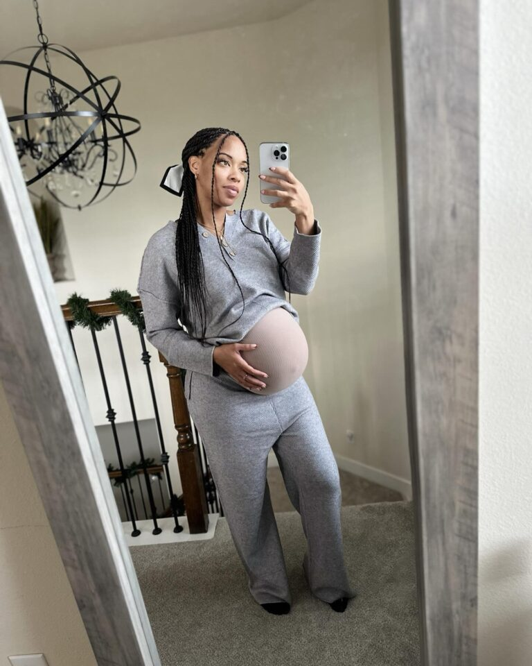 Loungewear gets a stylish upgrade with this gray ribbed set. The top’s partial front opening highlights the bump without compromising comfort, while matching pants keep the look cohesive. Neutral tones and soft fabric make it a maternity outfit that’s both calming and chic.