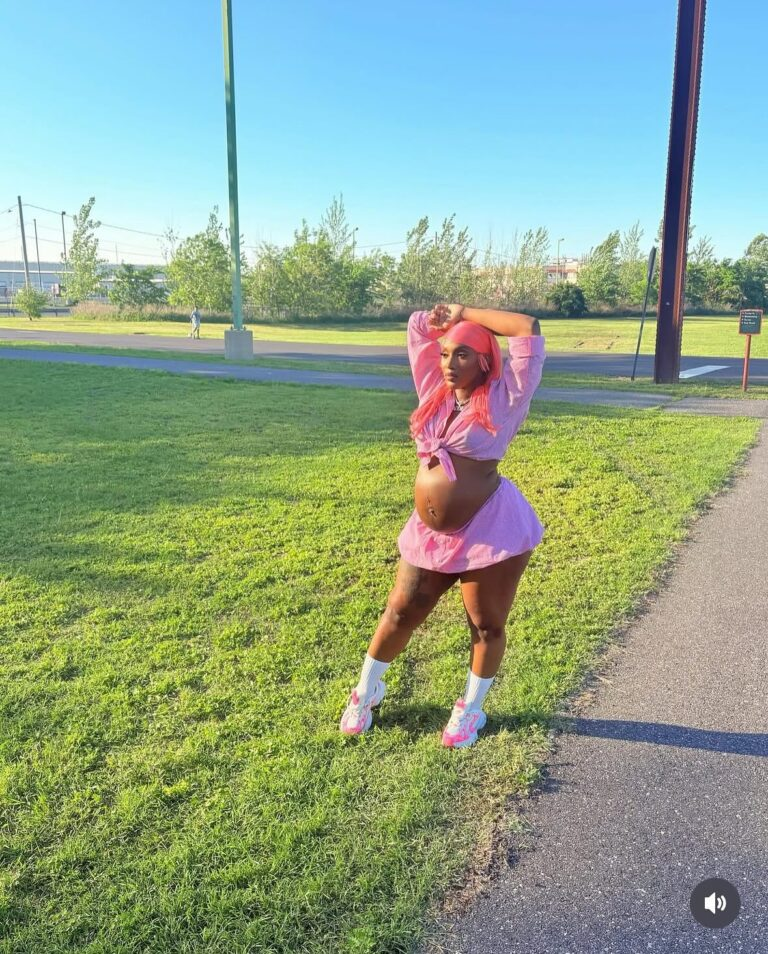 This coordinated gingham set keeps things lighthearted. A mini skirt and front-tie top highlight the belly with confidence, while tall socks and sneakers bring a sporty touch. Styled with matching pink hair, it’s a maternity look full of charm and attitude.