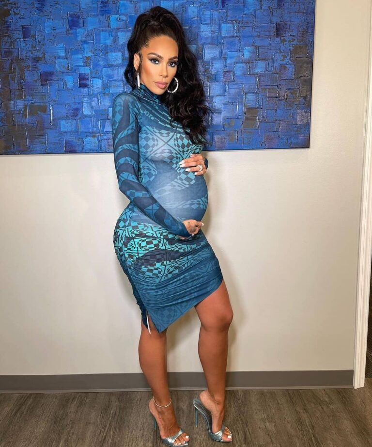 A sheer blue bodycon with abstract patterns fits like a second skin, showing every curve with ease. Long sleeves and a high neckline balance the bold print, while metallic heels add shine. It’s maternity fashion made for glam nights out.