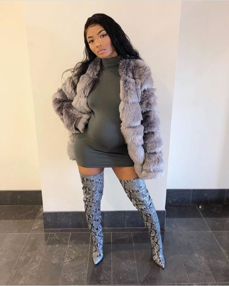 This winter-ready maternity look pairs a fitted turtleneck dress with a plush faux fur coat. Snakeskin boots add striking contrast, creating an outfit that’s equal parts bold and elegant—ideal for photoshoots or nights on the town.