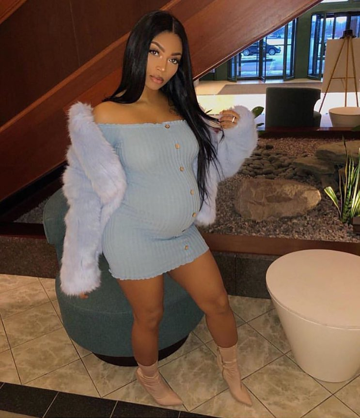 A ribbed off-shoulder dress flatters the figure while keeping focus on the neckline and bump. A pastel faux fur jacket adds softness and warmth, while sock boots pull the outfit together. The result is chic, feminine, and confidently baddie maternity style.
