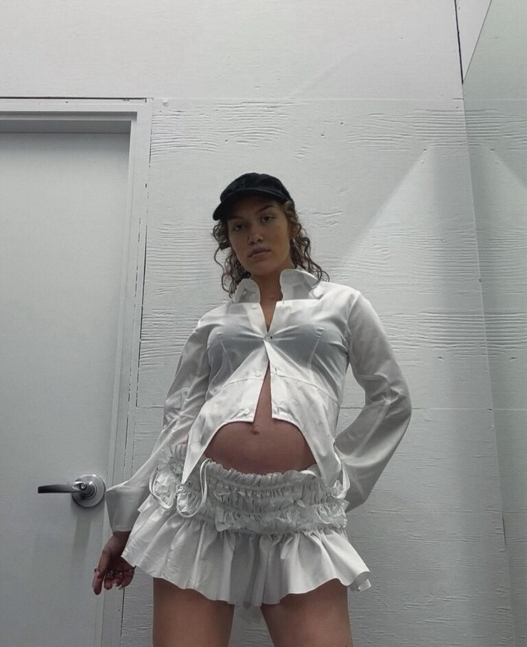 This maternity outfit balances classic tailoring with playful detail. A crisp button-up left partly open highlights the bump, while a ruffled skirt adds movement and charm. Styled with a black cap, the look combines polished pieces with streetwear ease, making it both daring and stylish.