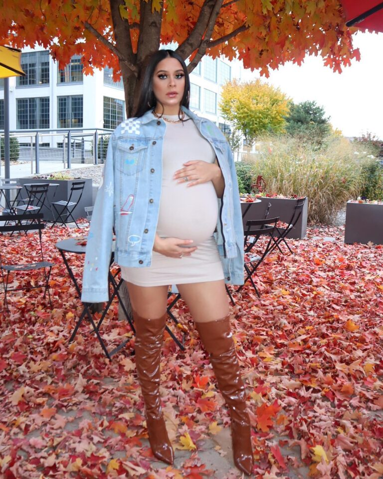 Neutral tones keep this maternity outfit sleek, while a fitted bodycon dress hugs the bump effortlessly. A patched denim jacket layers on personality, and thigh-high patent boots lengthen the frame with edge. It’s an ideal mix of casual and glam for autumn days.