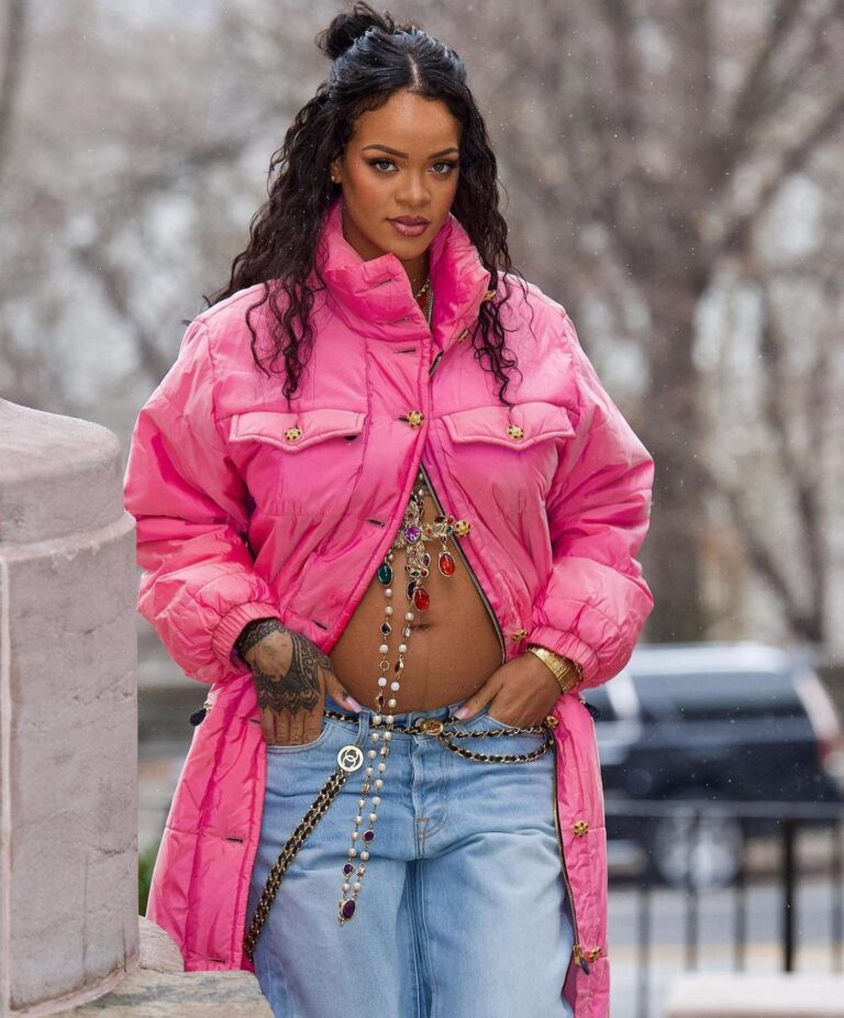 Bold and unapologetic, this maternity outfit features a pink puffer worn open over layered body jewelry. Low-rise jeans sit beneath the bump, putting the jewelry and belly at center stage. With pearl and gold accents, the look redefines maternity fashion with high-fashion sparkle and streetwear grit.