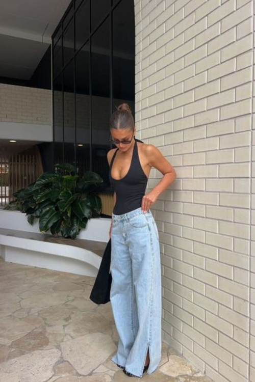 The sleekness of a fitted bodysuit paired with loose baggy jeans creates a flattering balance. I love wearing this for casual dinners or city outings—add heels or ankle boots, and it elevates the look without much effort.