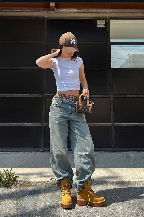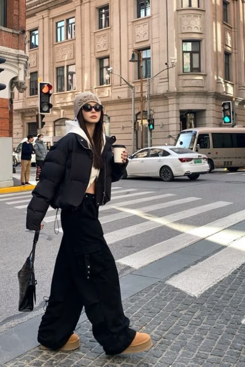In colder months, I reach for baggy cargo-style jeans with a crop hoodie and a puffer jacket. Pairing with UGGS or chunky boots keeps me snug and trendy. It’s functional for winter walks but still looks street-ready and intentional.