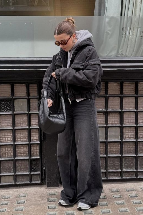 Switching to grey baggy jeans refreshes my look while keeping things neutral. Layering a jacket over a hoodie adds dimension and street-style credibility. I love this for cozy days when I want to stay warm but look intentionally styled.