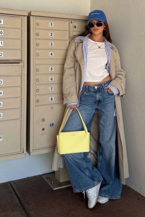 Layering a trench coat over a tee and button-down is my secret for a polished fall look. Baggy jeans anchor the outfit so it doesn’t feel too stiff, and I love that it transitions from coffee runs to casual meetings effortlessly. A neutral trench always elevates the entire ensemble.