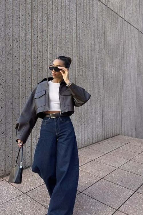 For edgier days, I reach for a cropped leather jacket over a simple crop tee with my baggy jeans. The contrast between structured leather and relaxed denim gives a bold, confident vibe. I always add black boots or chunky sneakers to finish this effortlessly cool look.