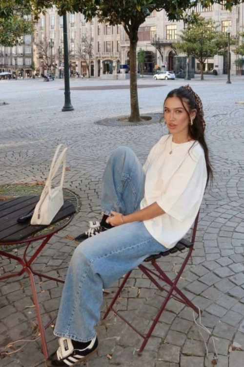 Sometimes, simplicity is key. A graphic oversized tee with baggy jeans and my favorite sneakers instantly gives me laid-back energy. I usually toss my hair in a casual bun and grab a tote bag for a no-fuss, stylish outfit that works for errands or a casual hangout.