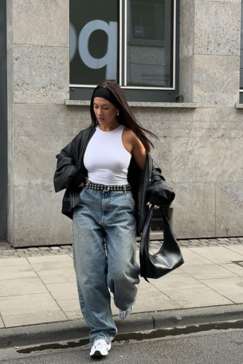 When I want to feel sharp yet relaxed, I combine a fitted bodysuit with baggy jeans and throw on a leather jacket. The fitted top balances the loose jeans and gives a flattering silhouette while still keeping the outfit edgy and chic.