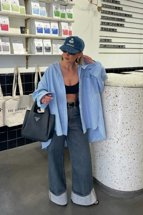An oversized button-down over a crop or bra top is my favorite street-style trick. It layers beautifully over baggy jeans and keeps the look functional. I usually cuff the sleeves and roll the hem slightly to make it effortless but still stylish.