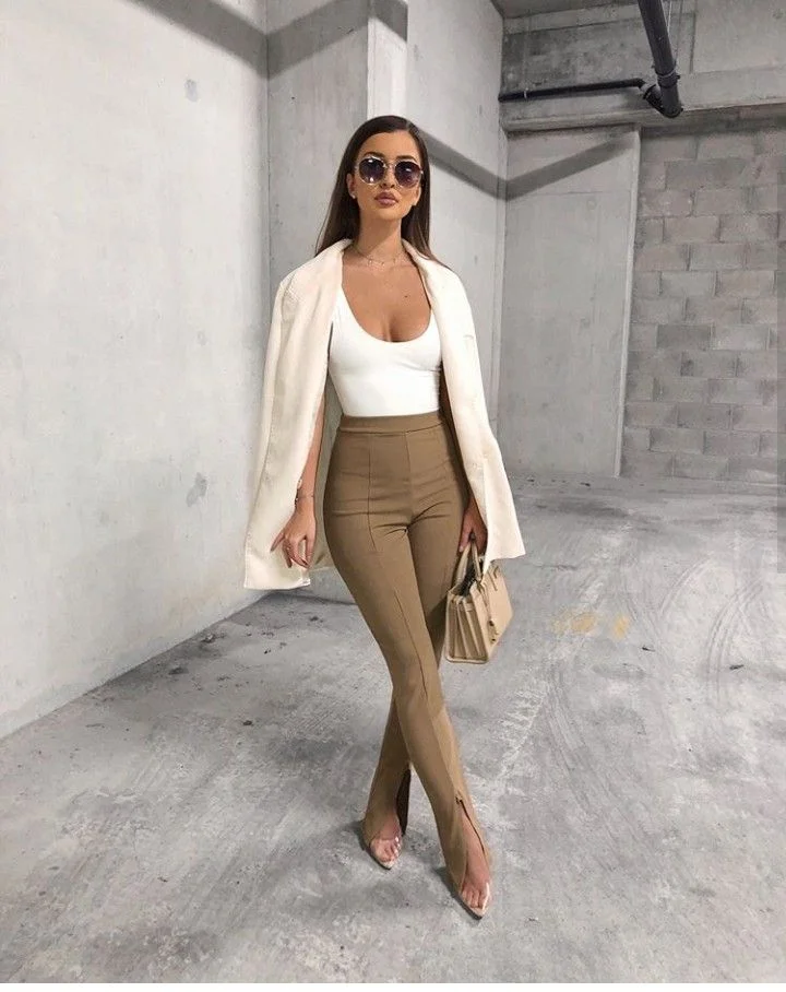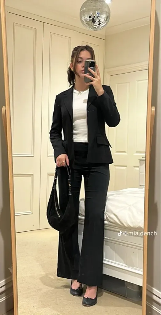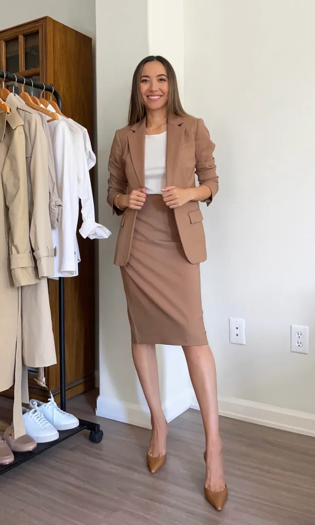 This look combines a structured blazer with matching pants. It is perfect for high-profile meetings and delivers a strong, professional impression.