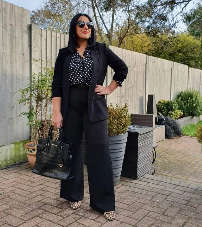 This outfit mixes classic and fun with a polka dot blouse. Wide-leg pants and a black blazer keep it professional. Printed flats add comfort and style.