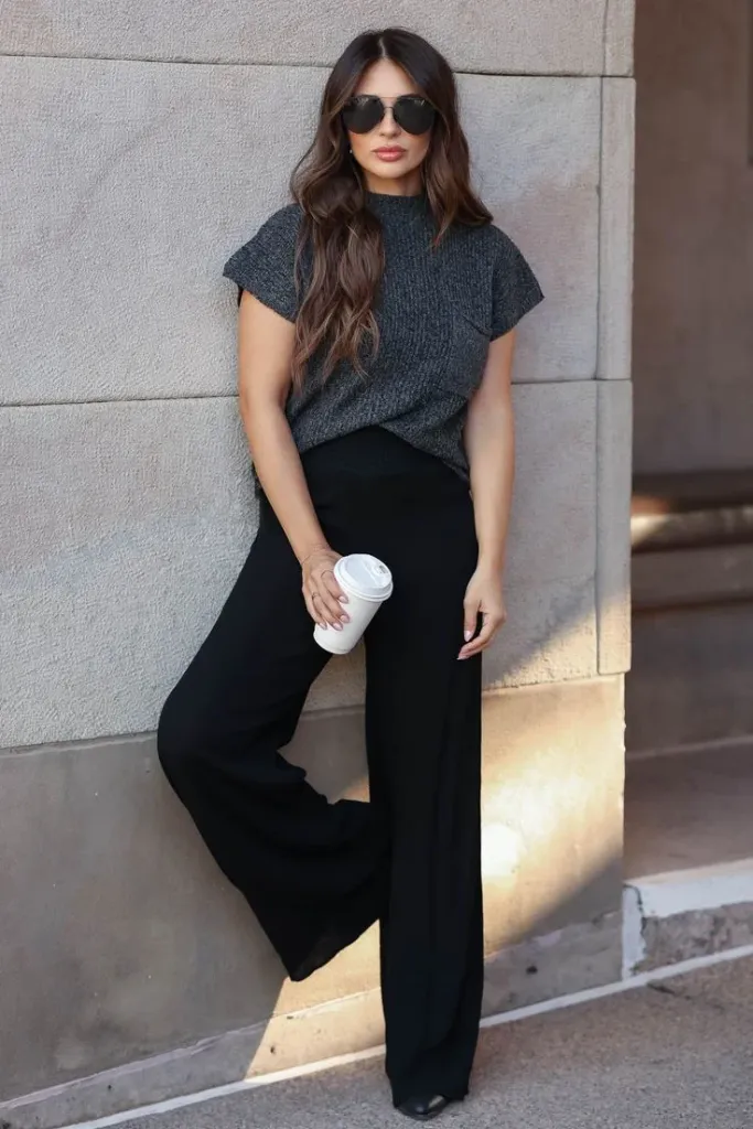 This outfit adds a trendy twist to business wear. The knot shirt and wide trousers are stylish and professional.