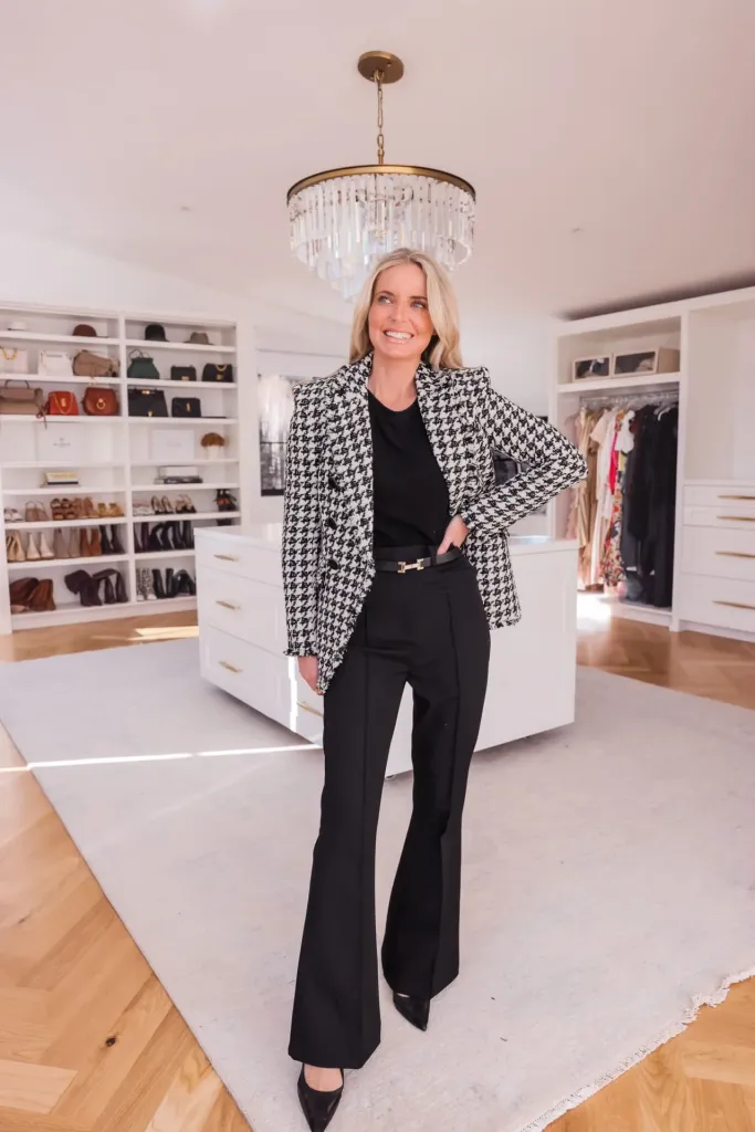 Black Top with Wide Leg Trouser Over Checked Blazer with Pumps