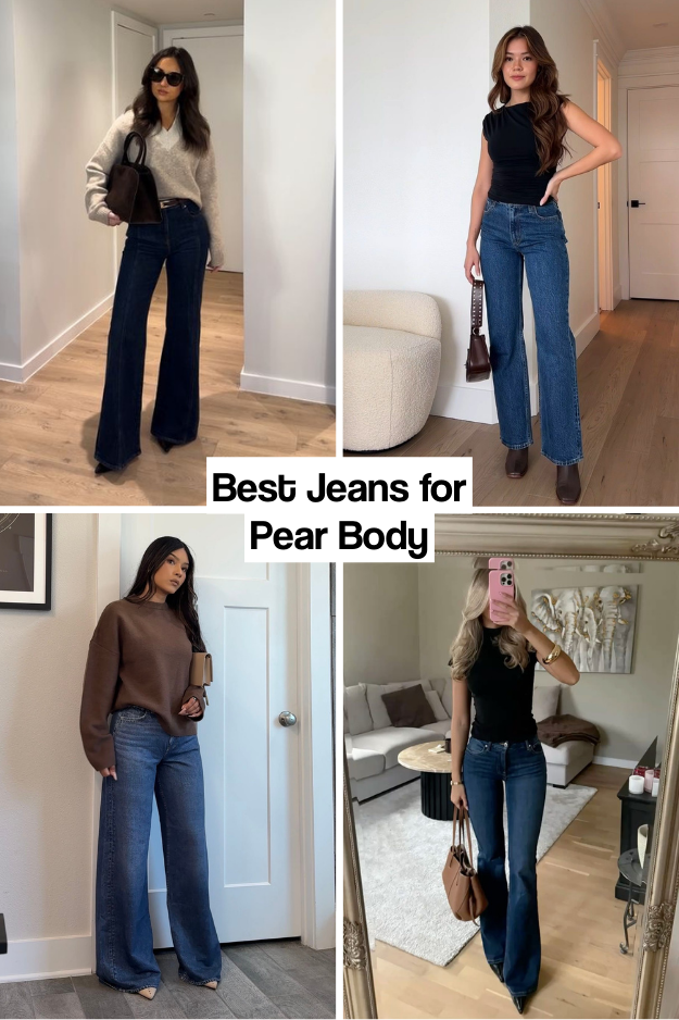 Pear-shaped bodies carry more volume at the hips and thighs than at the shoulders. The goal is to elongate the legs while balancing the upper body. Straight-leg or wide-leg jeans in a dark wash work best, as do subtle flares or bootcuts that balance the hips. High-rise jeans define the waist and lengthen the legs. Avoid skinny jeans that accentuate the widest part of your body and avoid heavy embellishments at the hips. Pairing jeans with tops that add volume to the shoulders — like structured blazers or oversized sweaters — balances the silhouette and enhances proportion.