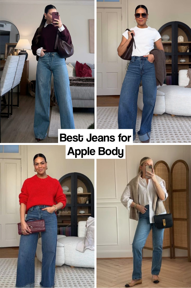 Apple-shaped bodies have more volume in the midsection and slimmer legs. Jeans should sit comfortably at the waist, create a long leg line, and avoid adding bulk to the torso. High-rise straight-leg or wide-leg jeans in dark, clean washes work best, and a slight stretch (2–3% elastane) ensures comfort while flattering the body. Avoid low-rise jeans that dig into the belly, rigid denim, and overly tapered styles that make proportions top-heavy. Stretchy denim moves with the body, preventing gaps and creating a sleek appearance throughout the day.