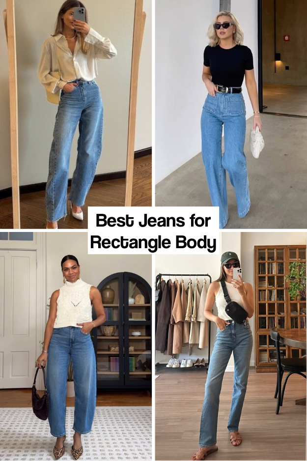 Rectangle-shaped bodies have minimal natural curves, with shoulders, waist, and hips of roughly equal width. Jeans should create the illusion of curves and a defined waist. Straight-leg, mom jeans, and barrel-leg styles add volume at the hips and thighs, while medium to light washes with subtle fading add dimension. Avoid dark, rigid, form-fitting jeans that emphasize a straight frame, and extremely wide-leg styles that lack waist definition. Adding a slim belt to tucked-in jeans is a simple way to create a waistline instantly.
