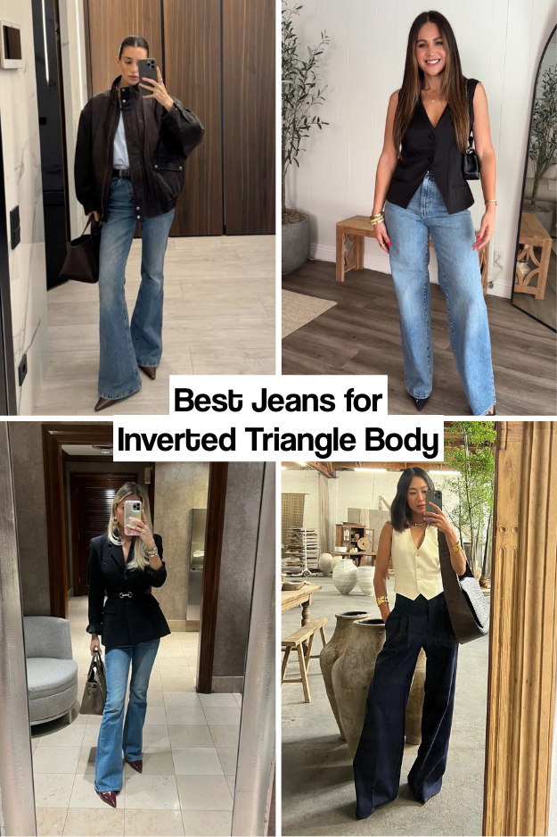 Inverted triangle figures have broader shoulders and narrower hips. Jeans should add volume to the lower body to create balance. Wide-leg, flare, and bootcut jeans are ideal, especially in lighter washes with subtle details like pockets or stitching to visually widen the hips. High-rise styles help define the waist. Avoid skinny or tapered jeans that narrow the lower half, exaggerating shoulder width. A subtle flare below the knee is the most flattering choice, balancing the silhouette without looking dated or exaggerated.