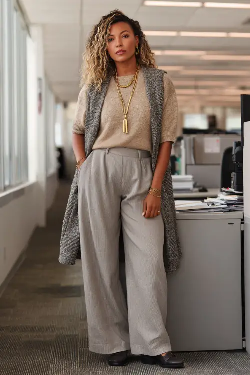 Layered necklaces add just enough personality without being too much. I usually finish this look with closed-toe flats or low heels to keep everything grounded and office-appropriate.