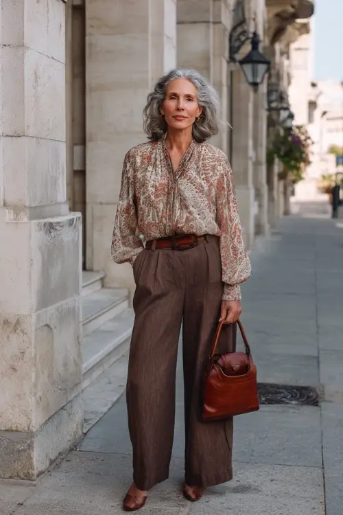 A wrap-style blouse offers gentle shaping at the waist while still feeling easy and breathable. When paired with high-waisted wide-leg trousers, the outfit feels elegant without becoming stiff or formal.