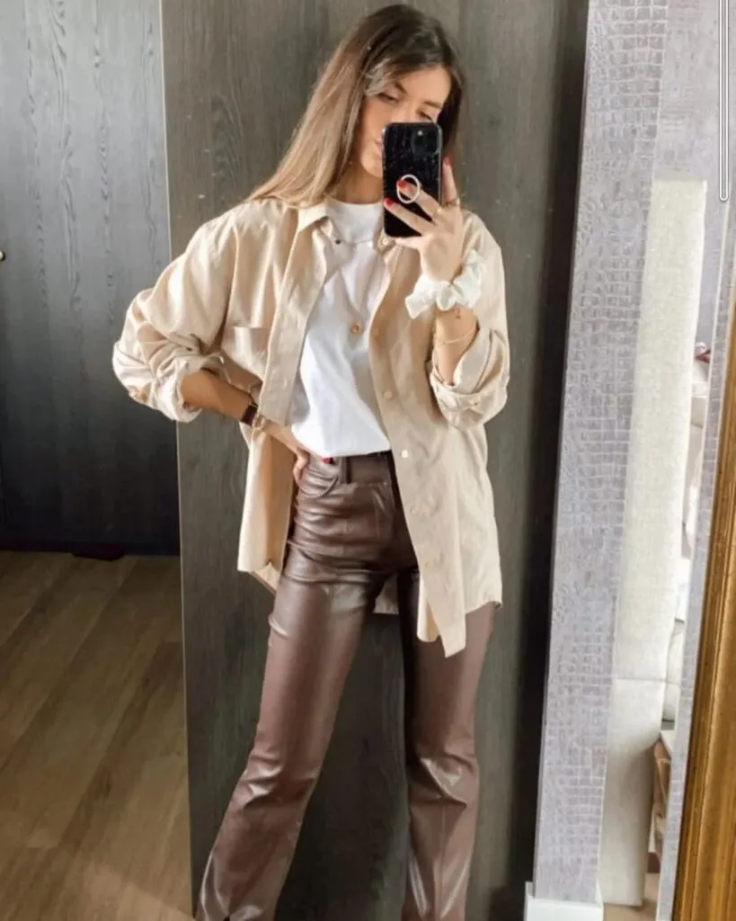 Combining a white shirt or beige blouse with brown leather pants is a classic and stylish choice. It’s a neutral palette that works for many occasions and looks effortlessly chic.