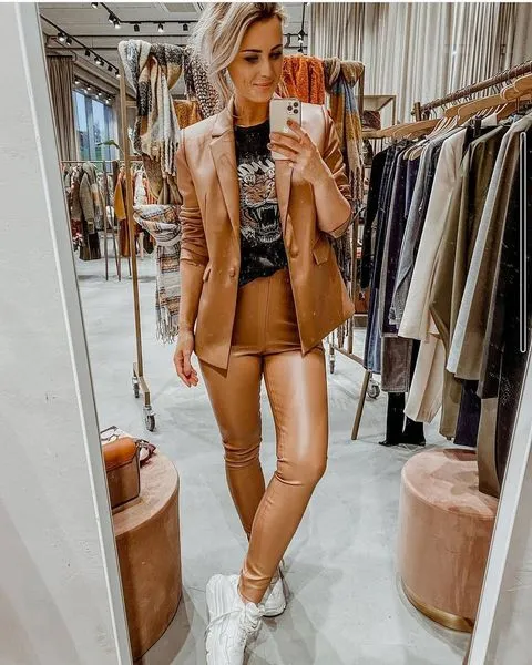 For a trendy and fashion-forward look, pair brown leather pants with a matching brown blazer and chunky sneakers. This combination mixes sporty and formal elements, perfect for a street-style vibe with polish.