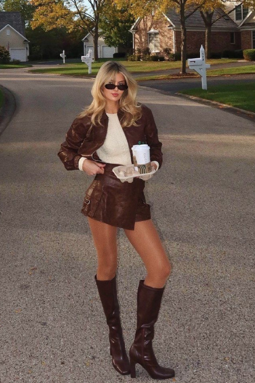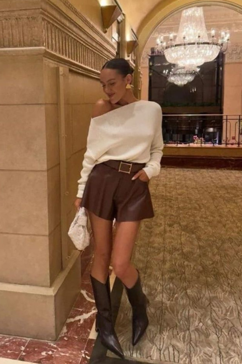 A matching leather jacket and brown shorts set creates a bold, confident statement. Styling it with statement accessories and tall boots pushes the look into evening-ready territory. It’s edgy, sleek, and perfect for making an impression.