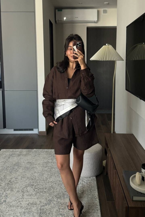 A matching oversized shirt and shorts set in brown tones feels comfortable yet fashion-forward. The relaxed silhouette gives off an easygoing vibe, while simple flats keep it grounded. Adding a waist detail, like tying a scarf, can define your shape without losing that relaxed feel.