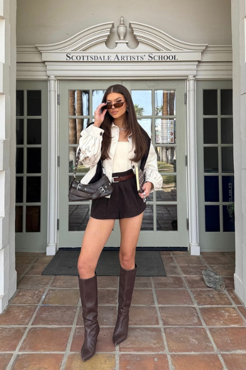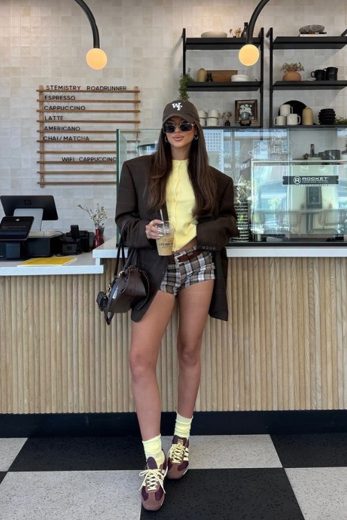 A plaid blazer instantly transforms a basic top and brown shorts into something more refined. Keeping the rest of the look neutral allows the pattern to stand out. Tall boots can add an editorial touch without overwhelming the outfit.