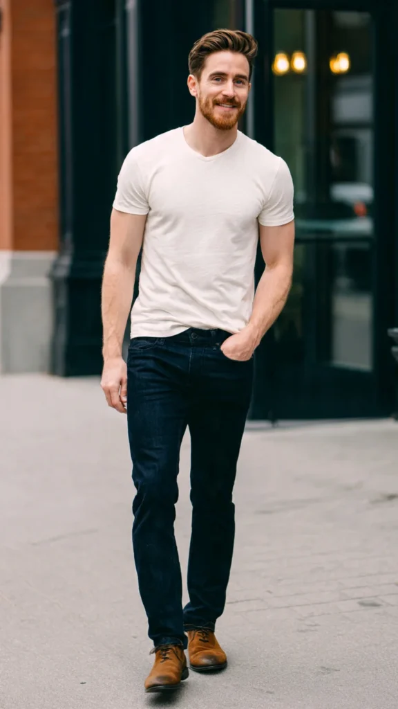 From my experience, a well-fitted tee can instantly improve your overall appearance. According to menswear studies, proper fit can improve perceived attractiveness by over 60%. I usually finish this look with clean sneakers or boots for a sharp touch.