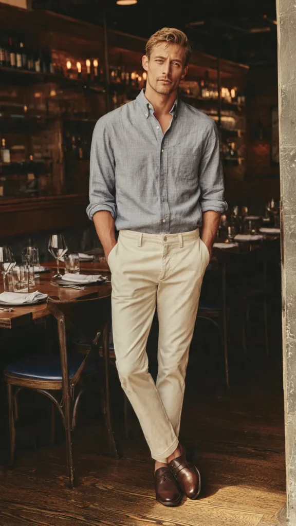 When I want to look slightly more put together, I switch to a button-down shirt with slim chinos. This outfit feels relaxed but still shows effort, which is important on a date. It works well for dinners or casual evenings out.