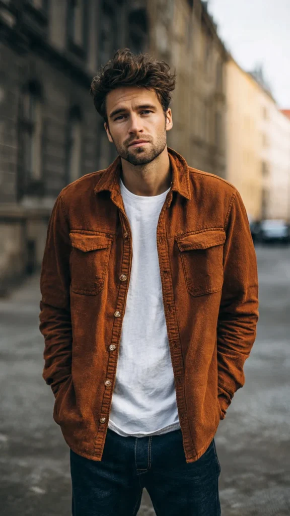 One of my go-to Casual Date Night Outfits for Men is an overshirt layered over a plain T-shirt with jeans. It adds depth without making the outfit feel heavy or overdressed.